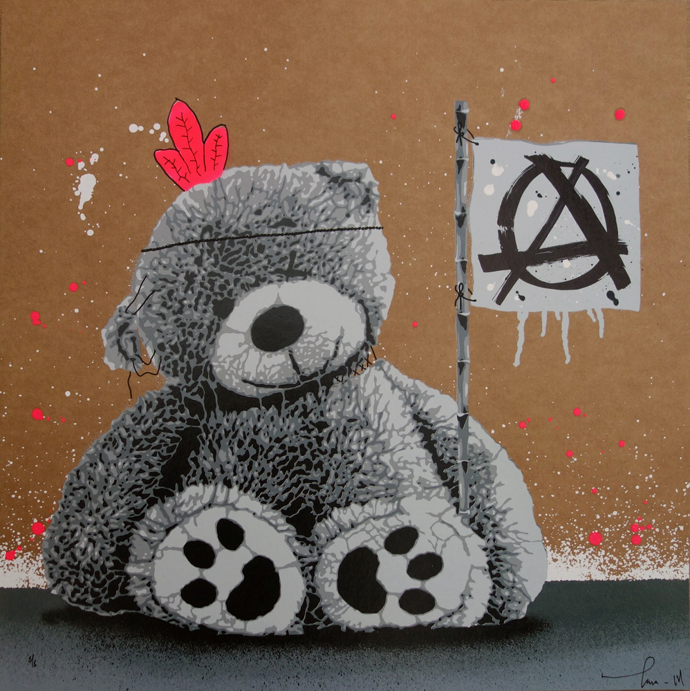 Edition of 5 all unique 5 colour screen print on 280 Gsm kraft Paper flag, bear and background hand finished by the artist signed and numbered by the artist Dimensions: 55 x 55 cm