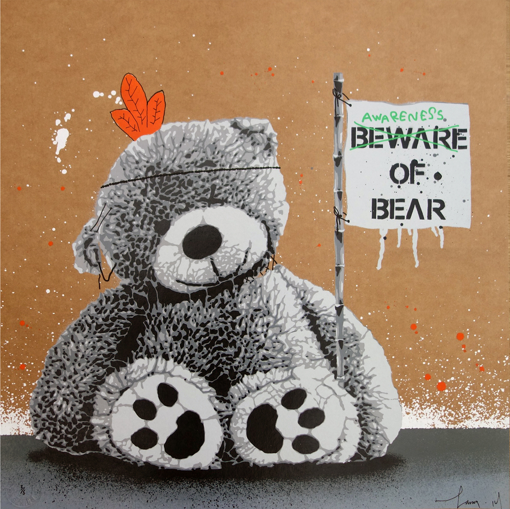 Edition of 5 all unique 5 colour screen print on 280 Gsm kraft Paper flag, bear and background hand finished by the artist signed and numbered by the artist Dimensions: 55 x 55 cm