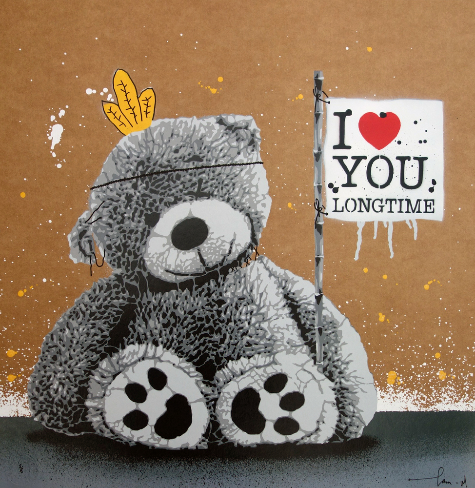Edition of 5 all unique 5 colour screen print on 280 Gsm kraft Paper flag, bear and background hand finished by the artist signed and numbered by the artist Dimensions: 55 x 55 cm