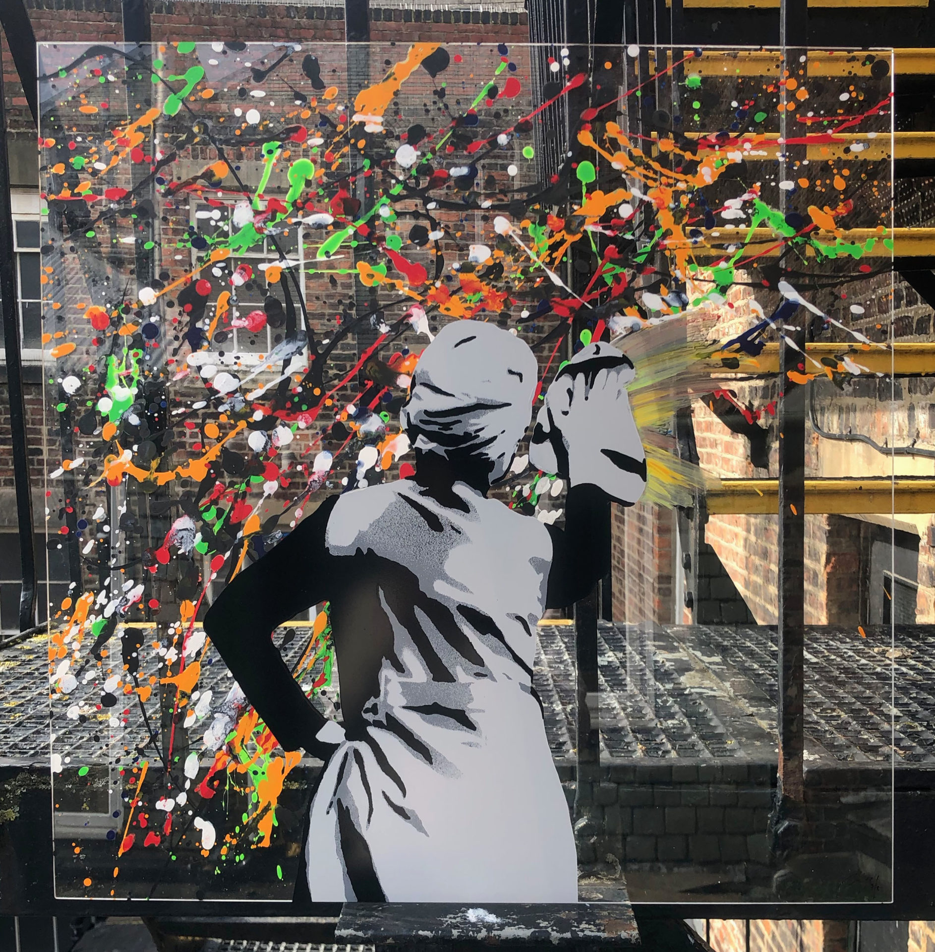 Edition of 8 3 colour screen printed Figure & Varnish on 4mm Clear Acrylic. hand painted paint splashes each one unique Signed By The Artist 60 x 60 cm 2019