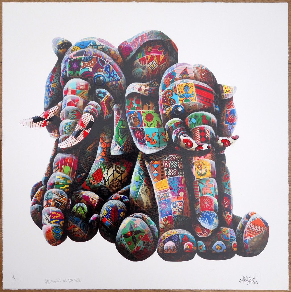 Edition of 20. 22 colour screen print on 300 gsm somerset paper Hand Painted Tusks & eyes. all unique Dimensions: 70 x 70 cm year 2017