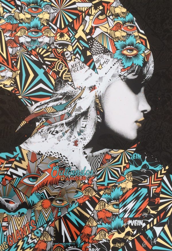 ARTIST PROOF – Alternative Colourway Edition of 10 Hand Finished with complimentary spray paint 6 colour screenprint on 330gsm Black Plike. 700 x 1000 mm Signed, stamped & numbered AP