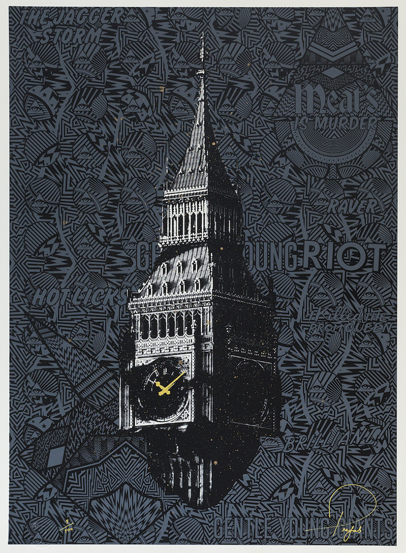 5 colour screen print on Somerset 300gm paper hand finished with metallic gold spray paint 56 x 76 cm signed stamped and numbered by the artists edition of 100