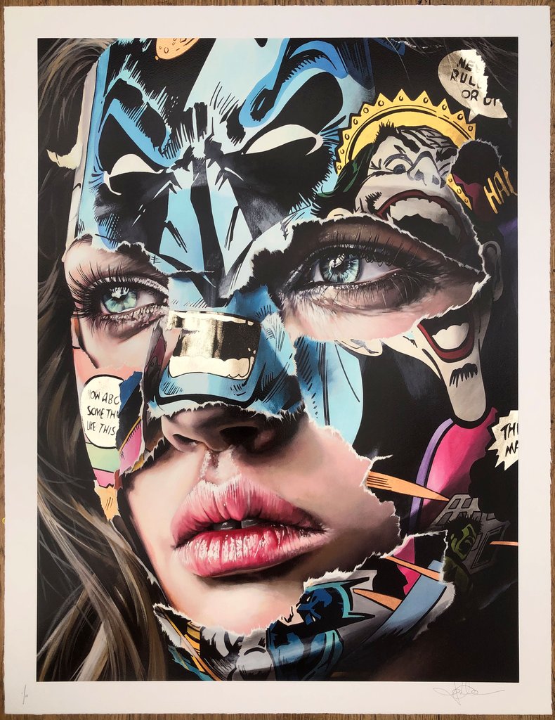With a 24ct cold leaf in the crown, Copper leaf at bottom right of print and disc at the tpp, speech bubbles and nose details 24ct white gold leaf.